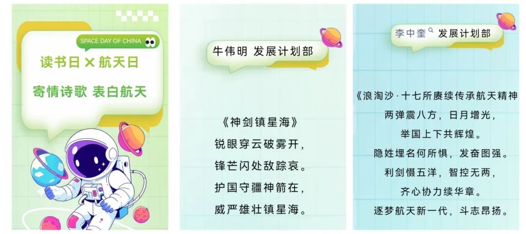 四院17所開展“讀書日X航天日 寄情詩歌 表白航天”活動,向各部門征集航天主題的詩詞,作品韻律優(yōu)美,展現(xiàn)了航天人的豪情壯志,抒發(fā)了對航天事業(yè)的無限熱愛。