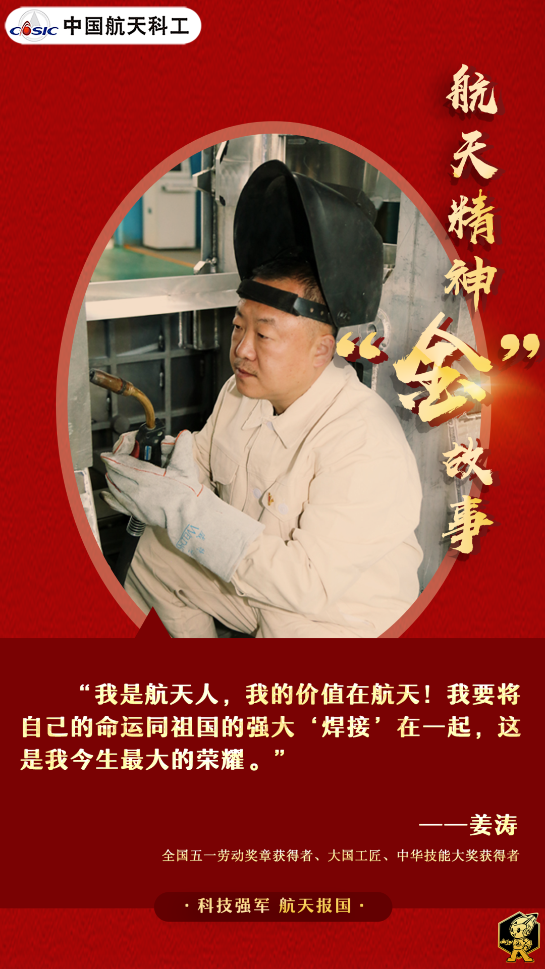 姜濤,是航天江南航天天馬的一名工人,當(dāng)選第十三屆全國人大代表,榮獲全國五一勞動(dòng)獎(jiǎng)?wù)拢硎車鴦?wù)院政府特殊津貼。37年來,他手執(zhí)焊槍,一次次攻破技術(shù)難關(guān),焊接產(chǎn)品多次接受黨和人民檢閱。