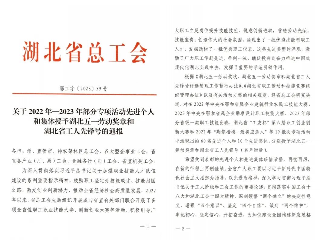 同時,從湖北省總工會《關于命名2023年荊楚工匠學院暨表揚省級優秀帶徒名師、學習型職工的通報》(鄂工字[2023]57號文)獲悉,公司職工呂品喜獲2023年湖北省“優秀學習型職工”榮譽稱號。